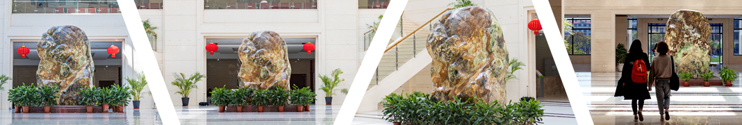 坐落于图书馆正厅的岫岩彩玉高约3米,重达9.9吨,其正面因玉包岩形的独特构造生成了绚丽的色彩,背面则以晶莹剔透的青玉为主。此玉原产地是辽宁鞍山,经过车运、海运辗转运至学校,是目前国内高校最大的一块岫玉,也是一块璞玉。 东汉许慎在《说文解字》中提到:“玉,石之美者。有五德,润泽以温,仁之方也;鳃理自外,可以知中,义之方也;其声舒扬,专以远闻,智之方也;不桡而折,勇之方也;锐廉而不忮,絜之方也。”中国自古以君子比玉,“玉不琢,不成器”,与笔墨书香相伴的岫岩彩玉勉励着上应学子在知识的海洋里磨砺己身、见贤思齐、孜孜以求、志存高远。 2012年10月建成。 |